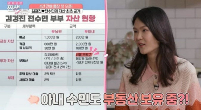 ■ 김경진은 아내 전수민에게 결혼 전 빌라를 선물했고, 그 빌라의 가격은 결혼 후 4억으로 상승했다고 한다.