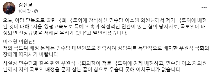 김선교 의원은 경기 여주·양평을 지역구로 두고 있으며, 이날 사회관계망서비스(SNS)에 "오늘 야당 단독으로 열린 국토위에 참석한 이 의원이 제가 국토위에 배정된 것에 대해 '서울-양평고속도로 특혜 의혹과 직접적인 연관이 있는 혐의 당사자로, 국토위에 배정되면 진상규명을 저해할 우려가 있다'고 발언했다"고 밝혔습니다.