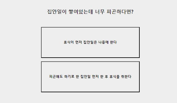 - 피곤해도 하기로 한 집안일 먼저 한 후 휴식을 취한다 / 휴식이 먼저 집안일은 나중에 한다' 등이 등장했다.