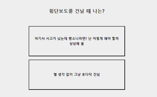 - 별생각 없이 그냥 후다닥 건넘 or 여기서 사고가 났는데 평소니라면? 난 어떻게 해야 할까 상상해 봄'