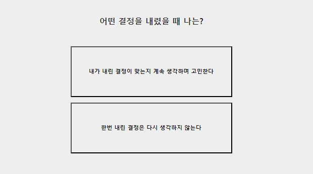 - 한번 내린 결정은 다시 생각하지 않는다 or 내가 내린 결정이 맞는지 계속 생각하며 고민한다