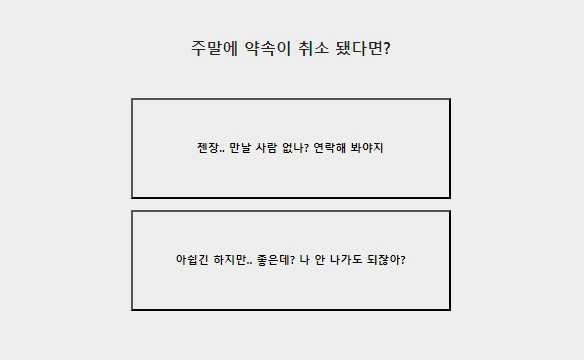 - 젠장.. 만날 사람 없나? 연락해 봐야지 or 아쉽긴 하지만.. 좋은데? 나 안 나가도 되잖아?