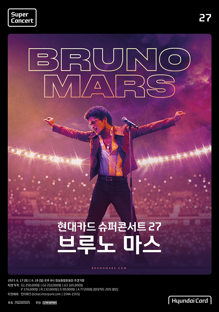 인기 절정의 팝스타 브루노 마스가 오는 6월 17~18일 서울 잠실종합운동장 주경기장에서 내한공연을 합니다. 현대카드는 자사 콘서트 브랜드 ‘슈퍼콘서트’의 27번째 행사로 브루노 마스가 내한한다고 밝히며 "이틀에 걸쳐 열리는 브루노 마스 슈퍼콘서트는 2017년 콜드플레이에 이어 두번째로 10만명 규모로 열리는 것”으로 “내한공연으로는 역대 최대 규모”라고 설명해 더욱 화재가 되고 있습니다.