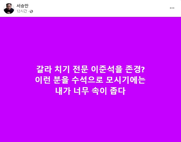 서승만씨는 24일 페이스북에서 "갈라치기 전문 이준석을 존경? 이런 분을 수석으로 모시기엔 내가 너무 속이 좁다"고 비판했습니다.