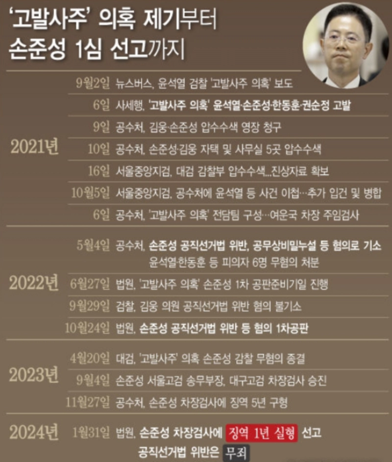 고발 사주 의혹의 핵심 인물로 지목된 손준성 차장검사가 1심 재판에서 징역 1년의 실형을 선고해 화재가 되고 있습니다.