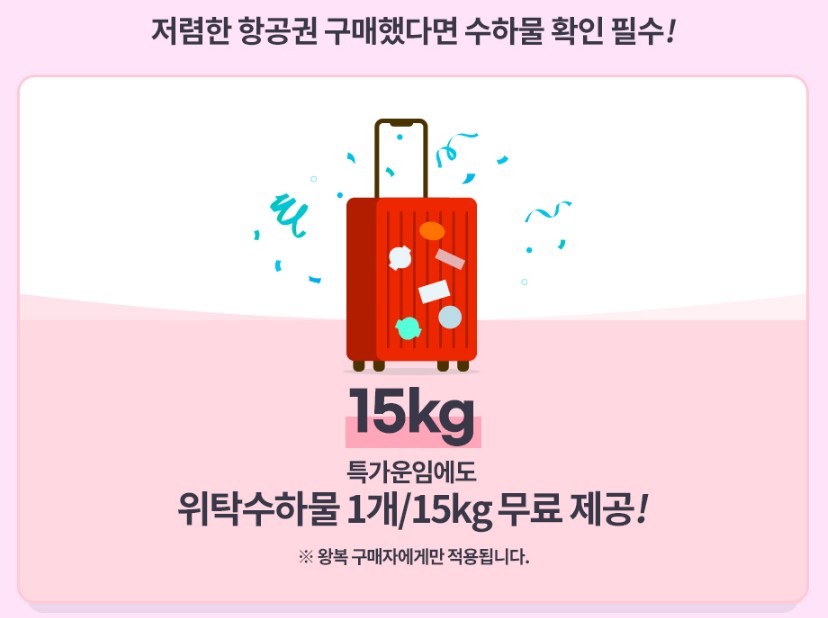 이번 프로모션에서는 특가 운임 항공권에도 위탁수하물을 무료로 제공하고 있습니다. 위탁수하물은 1PC, 15kg까지 무료로 이용할 수 있습니다.